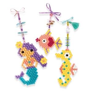 Una confezione per creare 3 decorazioni sospese sul tema marino con biglie da incollare con l'acqua. I bambini e le bambine posizionano il modello sotto la tavoletta trasparente bucherellata. Posizionano poi le biglie sulla tavoletta per riprodurre il disegno e spruzzano l'acqua sulla propria creazione. Una volta che le biglie sono asciutte, resteranno incollate come per magia! Poi potranno aggiungere le perline, il nastrino e i ciondoli per poter appendere le loro graziose creazioni.
