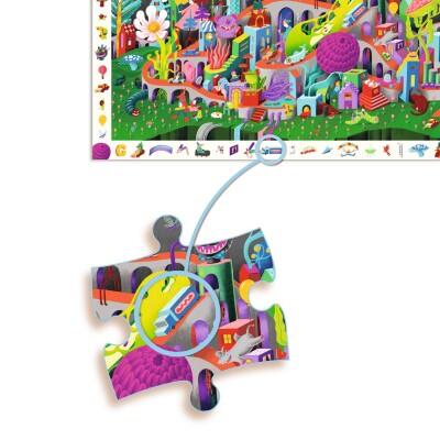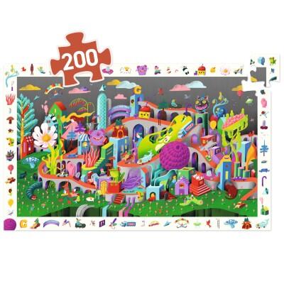 Un puzzle di osservazione da 200 tessere per scoprire una citt? fantastica dove volteggiano buffi personaggi. Il bambino realizza il puzzle e poi si diverte a ritrovare i diversi elementi nell’immagine.