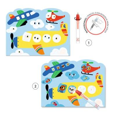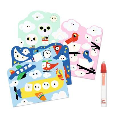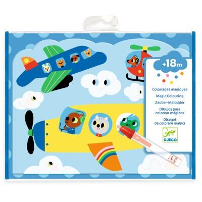 Un kit per colorare con i pennarelli ad acqua, ideale per i più piccoli a partire da 18 mesi. I bambini colorano con i pennarelli ad acqua le parti bianche per scoprire cosa si nasconde sotto. Che magia! Appaiono dei motivi e cambiano i colori! Le tavole si asciugano e si ricomincia!