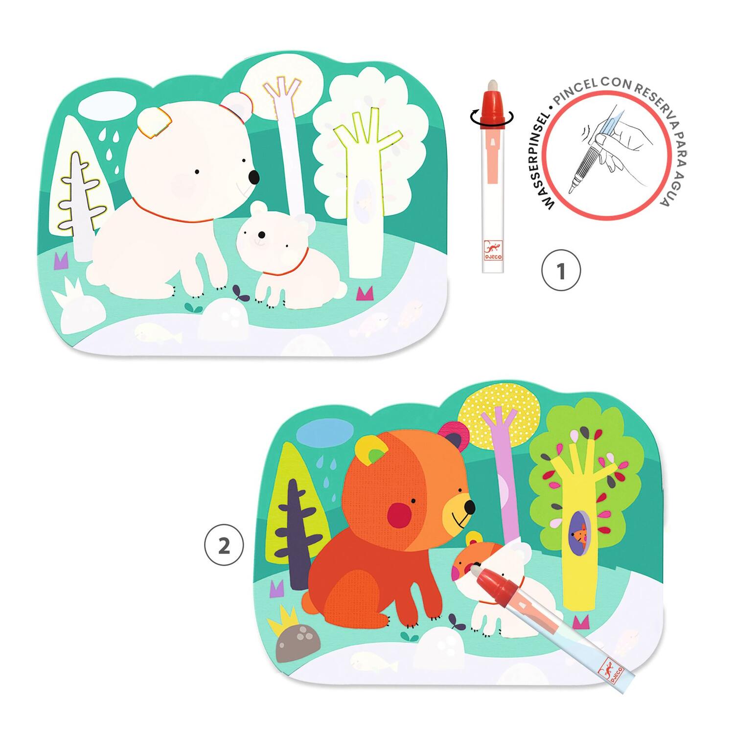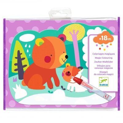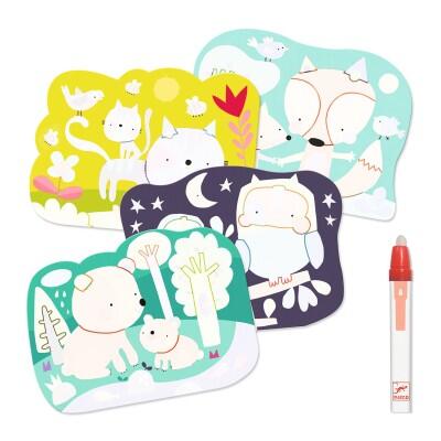 Un kit per colorare con i pennarelli ad acqua, ideale per i più piccoli a partire da 18 mesi. I bambini colorano con i pennarelli ad acqua le parti bianche per scoprire cosa si nasconde sotto. Che magia! Appaiono dei motivi e cambiano i colori! Le tavole si asciugano e si ricomincia!