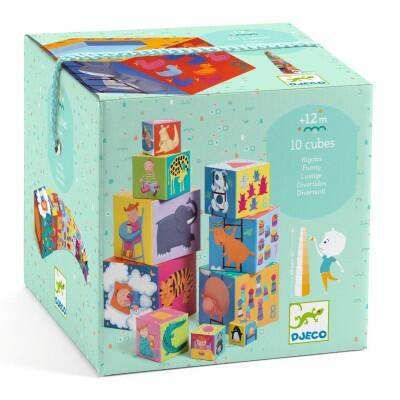 10 cubi in cartone spesso da incastrare, sovrapporre e far cadere quanto si vuole! I bambini sovrappongono i cubi in modo che le illustrazioni creino una sequenza logica.