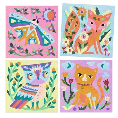 4 dipinti che presentano animali notturni da colorare con sabbie colorate e fosforescenti. I bambini mettono il quadro nella scatola, svelano le aree preincollate con l'apposito utensile e le cospargono quindi di sabbia seguendo il codice cromatico indicato nel libretto. Una volta che i dipinti sono esposti, che sorpresa al calar della sera: le illustrazioni sono visibili al buio!