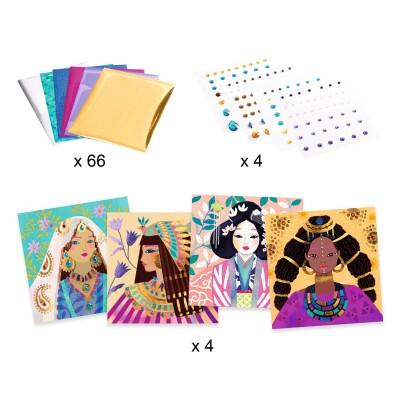Grazie ai codici colori indicati sulle schede, il bambino o la bambina identifica le aree da metallizzare. Scopre la pellicola che protegge la superficie incollata, quindi vi colloca il foglio metallizzato. Il materiale si deposita come per magia! In seguito, incolla i brillantini per illuminare i quadri.