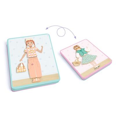 Il bambino o la bambina gioca con calamite di legno su una scatola di metallo sottile. Riproduce i 12 outfit rappresentati sulle carte scegliendo il lato giusto della scatola.