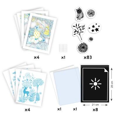Questa magica attività si ispira a un procedimento preso in prestito dalla fotografia: la cianotipia. Con dei motivi opachi il bambino crea dei decori su una carta fotosensibile. Dopo l’esposizione al sole la carta è contrassegnata da motivi in negativo. Bisogna solo risciacquare la carta in una vasca con acqua pulita e la decorazione si rivela su fondo blu! Queste creazioni diventano i fondi notturni che completano le illustrazioni di 4 quadri poetici.